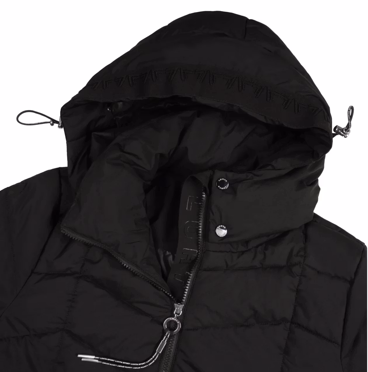 Varm och stilren täckkappa från Luhta. Kappan har avtagbar huva, elastiska inre muddar, fodrade fickor med dragkedja fram samt en intern ficka med dragkedja.